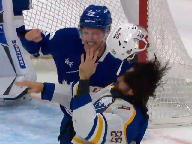 Watch as things get chippy between the Toronto Maple Leafs and the Buffalo Sabres, as Jake McCabe blasts Bowen Byram with a huge hit, prompting Alex Tuch to drop the gloves only to get slapped with an instigator penalty.