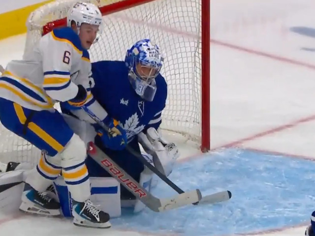 Buffalo Sabres forward Jiri Kulich loses a potential game-tying goal after the on-ice officials determined that Zach Benson interfered with Toronto Maple Leafs netminder Cayden Primeau midway through the second period.